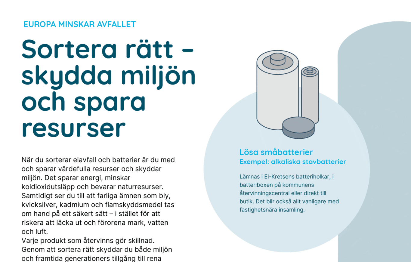 När du sorterar elavfall och batterier är du med och sparar värdefulla resurser och skyddar miljön. Det sparar energi, minskar koldioxidutsläpp och bevarar naturresurser. Samtidigt ser du till att farliga ämnen som bly, kvicksilver, kadmium och flamskyddsmedel tas om hand på ett säkert sätt – i stället för att riskera att läcka ut och förorena mark, vatten och luft.