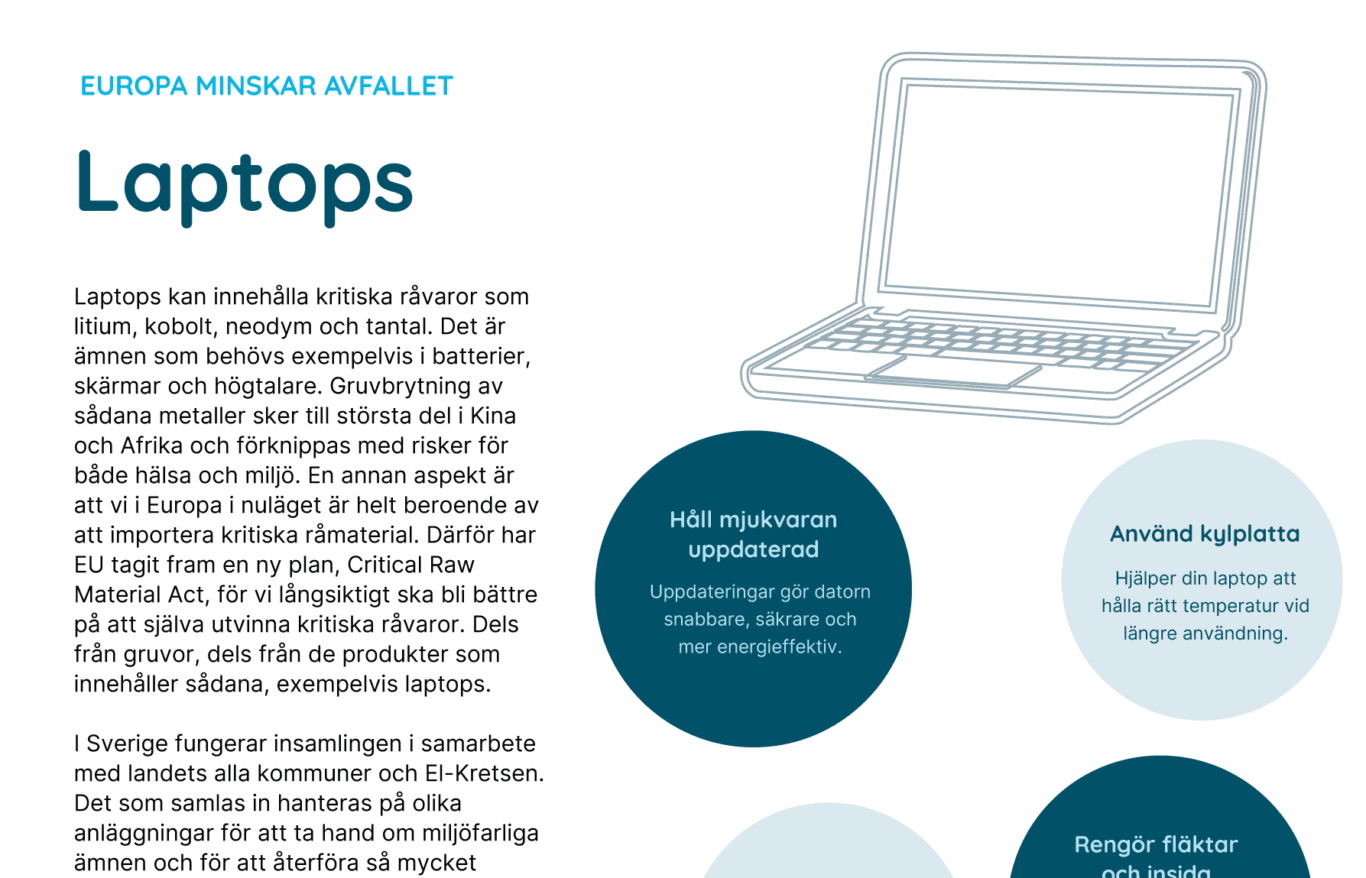 Laptops kan innehålla kritiska råvaror som litium, kobolt, neodym och tantal. Det är ämnen som behövs exempelvis i batterier, skärmar och högtalare. Gruvbrytning av sådana metaller sker till största del i Kina och Afrika och förknippas med risker för både hälsa och miljö. En annan aspekt är att vi i Europa i nuläget är helt beroende av att importera kritiska råmaterial. Därför har EU tagit fram en ny plan, Critical Raw Material Act, för vi långsiktigt ska bli bättre på att själva utvinna kritiska råvaror. Dels från gruvor, dels från de produkter som innehåller sådana, exempelvis laptops.